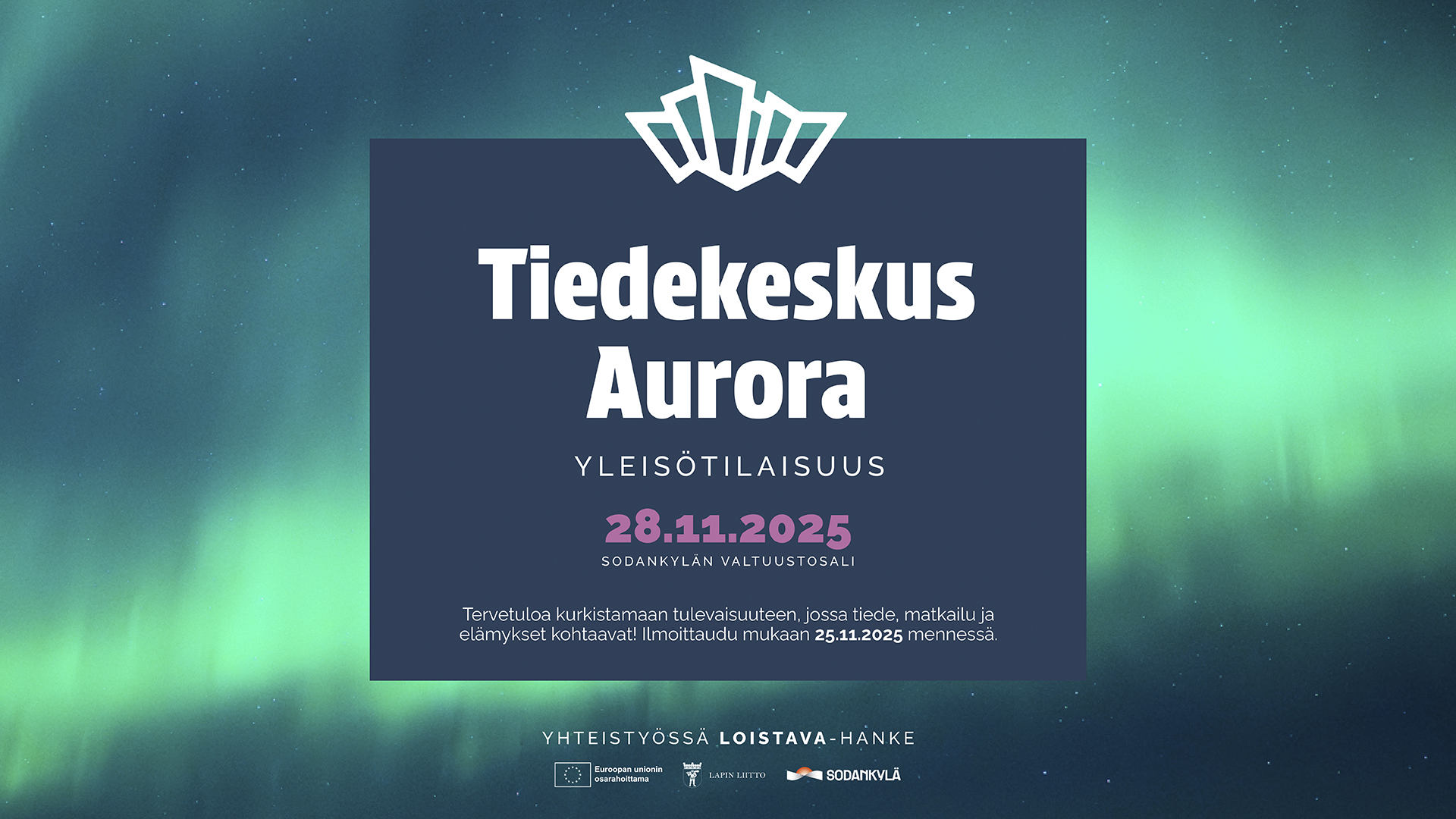 Tule kurkistamaan tulevaisuuteen, jossa tiede, matkailu ja elämykset kohtaavat! Tiedekeskus Aurora -projektin kaikille avoin yleisötilaisuus järjestetään 28.11.2025 klo 15 alkaen Sodankylän valtuustosalissa (Jäämerentie 1) yhteistyössä LOISTAVA – Taivaanilmiöt kestäviksi matkailutuotteiksi -hankkeen kanssa.